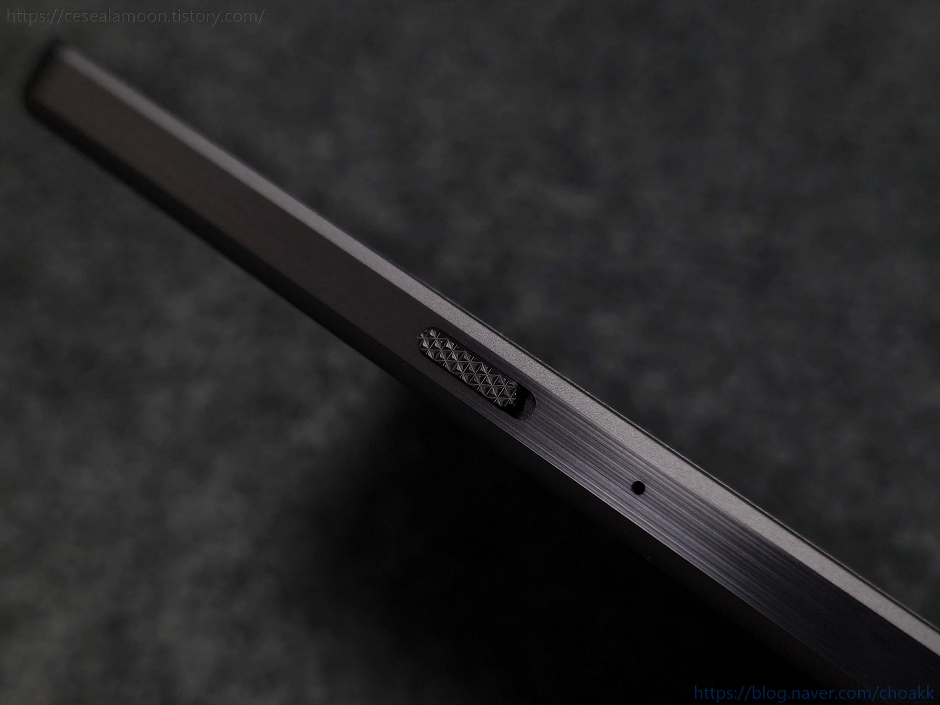 상단 측면에는 볼륨 버튼, 전원 버튼, 커스텀 가능한 스위치 버튼이 들어가 있고