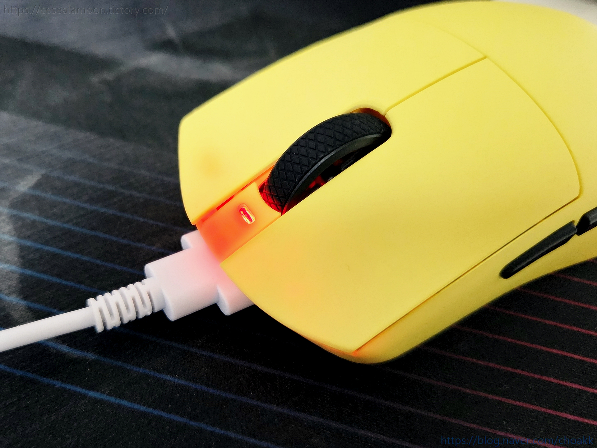마우스에 유선으로 연결하니 붉은색 LED가 잠깐 나오며 충전 중을 표시해 주었고